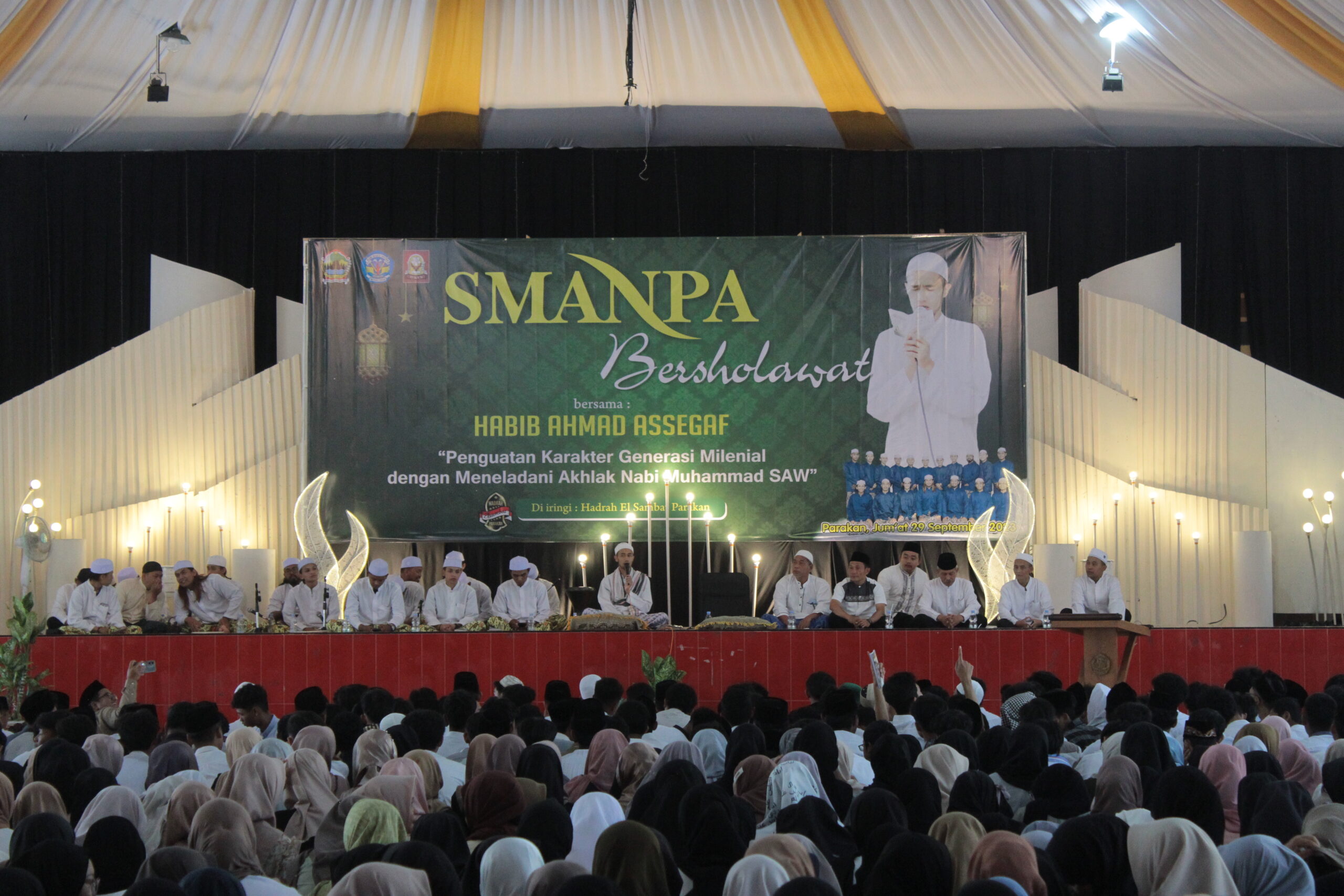 Setelah duduk di atas panggung yang telah disediakan, Habib Ahmad mulai melantunkan shalawat-shalawat andalannya yang diiringi tabuhan rebana Hadrah El Sambat. Suasana semakin meriah saat para siswa mengikuti lantunan dan senandung shalawat tersebut dengan penuh khidmat.