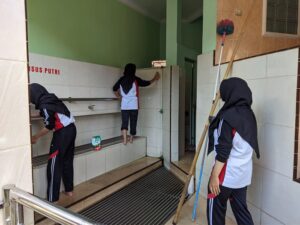 Kegiatan bersih-bersih masjid diantaranya menyapu ruangan, menggulung karpet dan merapikannya kembali, membersihkan kamar kecil dan area wudhu serta merapikan mukena dan Alquran yang ada di lemari.